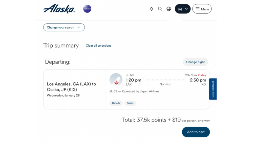 こちらはOperated By Japan Airlinesとあるので、アラスカ航空の37500マイル+$19でJAL便に乗れることがわかります。
