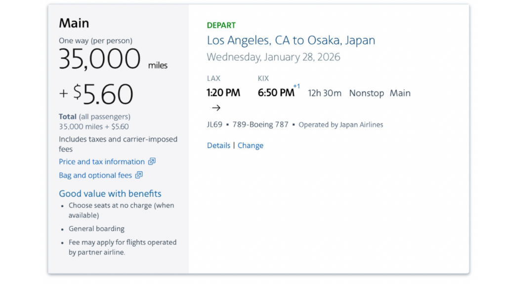 先ほどのアラスカ航空の例と同じロサンゼルスー関西空港の便に35000マイルと$5.60の支払いで乗ることができます。