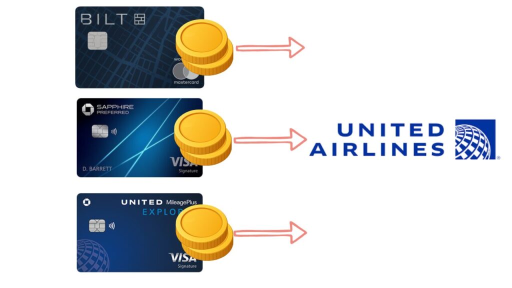 - ・Chase系クレジットカード(Sapphireなど)を日常の支払いに使う。貯めたポイントを1000ポイント=1000マイルでユナイテッドのマイルに交換