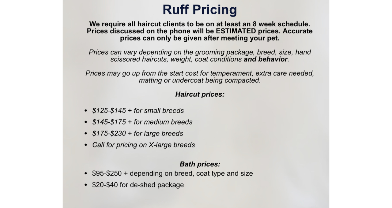 ドゥードルやプードルなどのヘアカットが必要になる犬種のおおよそのサービス代(ruff pricing)はこちら。