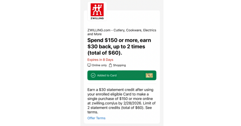 カードの管理画面に「Williams Sonomaで$100以上使うと$20バック」や「Sur La Tableで5%バック」といったクーポンが届いていることがあります。